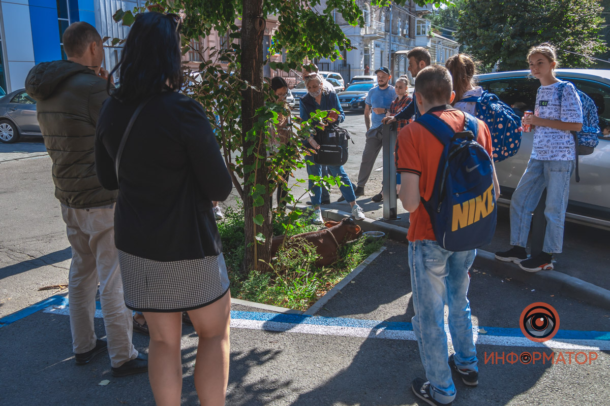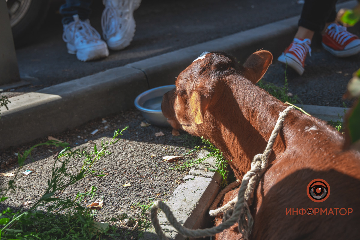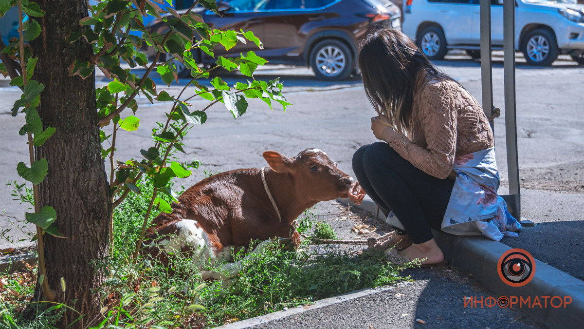 В Днепре на улице Жуковского прохожие увидели теленка и свинку, которые просто гуляли по улице. Как оказалось, они живут в квартире неподалеку с американкой Алисой Дей.