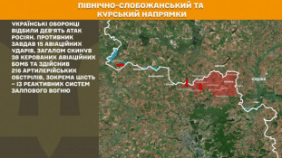 На Північно–Слобожанському і Курському напрямках українські оборонці відбили дев’ять атак росіян. Противник завдав 15 авіаційних ударів, загалом скинув 38 керованих авіаційних бомб та здійснив 216 артилерійських обстрілів, зокрема шість – із реактивних систем залпового вогню.