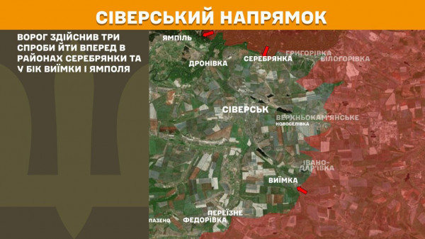На Сіверському напрямку ворог здійснив три спроби йти вперед в районах Серебрянки та у бік Виїмки і Ямполя.