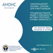 Фахівці Кам`янської філії ДОЦЗ запрошують роботодавців взяти участь в інформаційному онлайн-семінарі «Працевлаштування людей з інвалідністю та активні програми служби зайнятості», який відбудеться 16 жовтня.