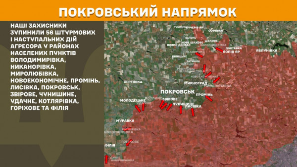 На Покровському напрямку наші захисники зупинили 56 штурмових і наступальних дій агресора у районах населених пунктів Володимирівка, Никанорівка, Миролюбівка, Новоекономічне, Промінь, Лисівка, Покровськ, Звірове, Чунишине, Удачне, Котлярівка, Горіхове та Філія.