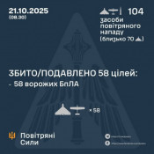У ніч на 21 жовтня окупанти атакували Україну 2-ма балістичними ракетами Іскандер-М/KN-23 із Брянської обл., 4-ма зенітними керованими ракетами С-300 із Курської обл., 98-ма ударними БпЛА типу Shahed, Гербера і безпілотниками інших типів із напрямків із міст Курськ, Орел, Приморсько-Ахтарськ , Чауда, Гвардійське, ТОТ Криму. Близько 70 – ти БпЛА – "шахеди".