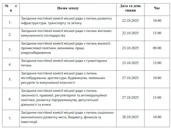 Засідання постійних комісій КМР відбуватимуться з 22 по 28 жовтня.