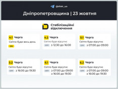 ДТЕК – офіційний канал: надаємо графіки стабілізаційних відключень електроенергії на Дніпропетровщині на сьогодні, 23 жовтня.