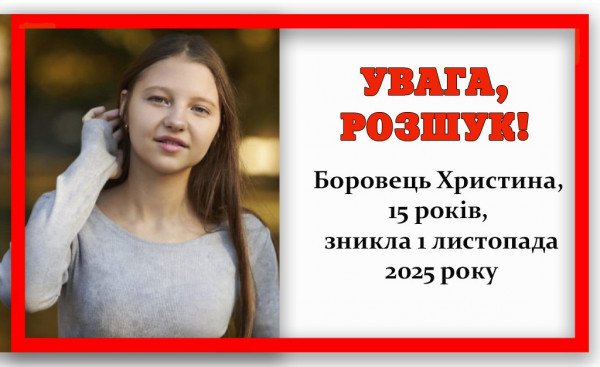 За наявності будь-якої інформації щодо місцезнаходження Христини Боровець (2010 року народження), будь ласка, телефонуйте на номери: 096-586-94-41 або 102.