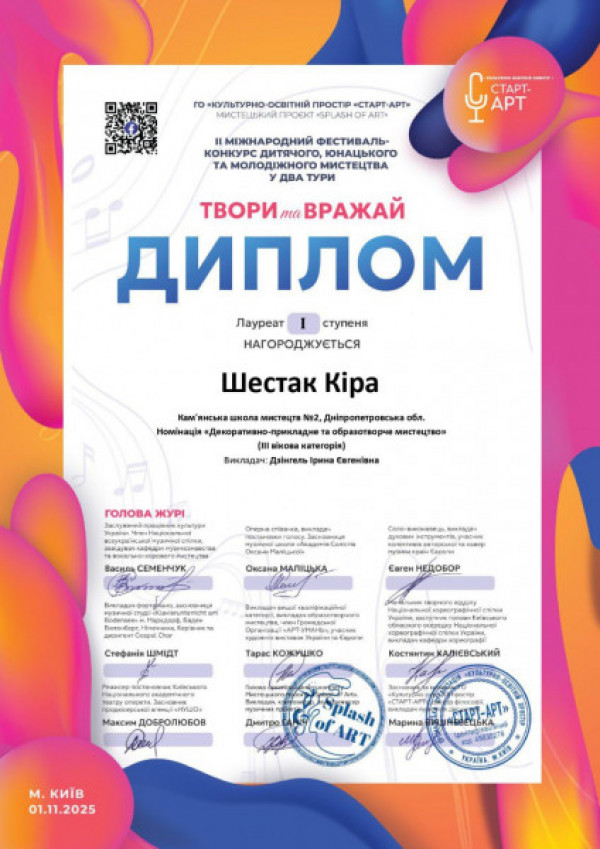 У номінації “Декоративно-прикладне та образотворче мистецтво” Камʼянську школу мистецтв №2 гідно представила учениця Кіра Шестак, яка навчається у класі викладача Ірини Дзінгель.