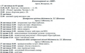 У Центральній бібліотеці імені Шевченка – інтерактивні ігри, творча виставка, мовні курси, бібліотерапія тощо. У юнацькому відділі заплановано концерт, курс української та клуб кіно.