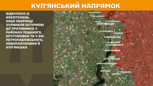 На Куп’янському напрямку вчора відбулося 12 боєзіткнень. Наші оборонці зупинили штурмові дії противника у районах Піщаного, Кругляківки та у бік Петропавлівського, Новоплатонівки й Куп’янська.