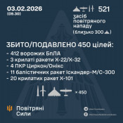 За попередніми даними, станом на 09:30, протиповітряною обороною збито/подавлено 450 цілей – 38 ракет та 412 безпілотників різних типів: