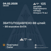 У ніч на 4 лютого окупанти атакували Україну 105 - ма ударними БпЛА типу Shahed, Гербера, Італмас та безпілотниками інших типів, близько 70 із них – "шахеди".