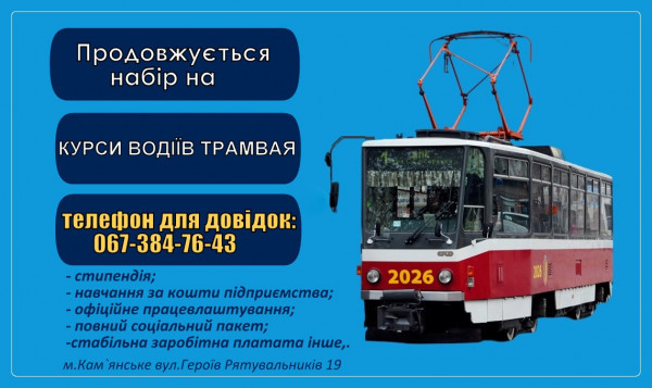 Комунальне підприємство Кам’янської міської ради "Транспорт" розпочинає формування нової групи учнів. Мешканцям міста пропонують безоплатно здобути фах водія електротранспорту з подальшим гарантованим працевлаштуванням