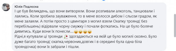 За її словами, останнім часом там фіксують випадки неналежної поведінки, зокрема розваги, танці та фотосесії. Вона наголосила, що кладовище має залишатися місцем пам’яті та поваги до загиблих захисників.
