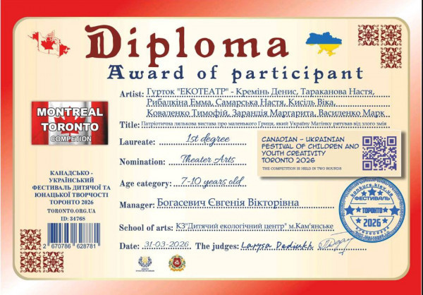 Колектив «Екотеатр» Дитячого екологічного центру Кам’янського здобув перемогу на Канадсько-українському фестивалі дитячої та юнацької творчості «Торонто-2026».